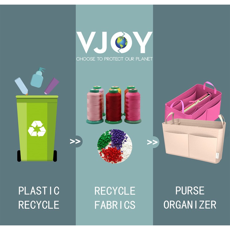 - MAKE THE SMART CHOICE TO PROTECT OUR PLANET : VJOY Purse Organizer use recycled plastic bottles, clean, chop, melt and turned into plastic chips. Chips are transformed into recycled fabrics, and make the Tote Bag Organizer Insert.