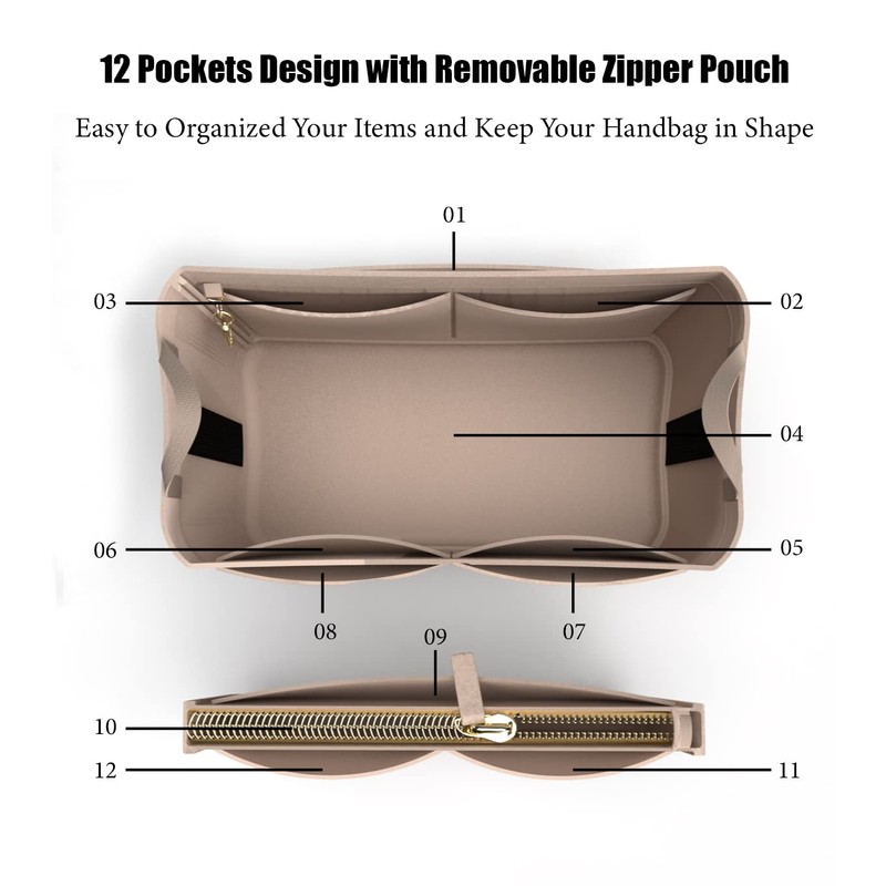 - KEEP BAG CLEAN & SHIPSHAPE: 12 Pockets Total Purse Organizer, 3 exterior pockets, 9 interior pockets with singly detachable pocket in the middle which can keep valuable articles or used as a separate wallet after detached. Extra detachable keys chain help find the keys easily. It keeps everything neat and well organized shaped.
