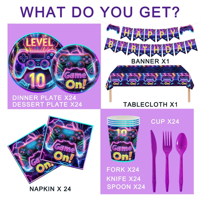 Vlipoeasn 146pcs 10th Birthday Video Game Party Plates, Purple 24 Guests Disposable Paper Plates, Hanging Swirls, Balloons and Happy Birthday Banner for Level 10 Gamer Birthday Party