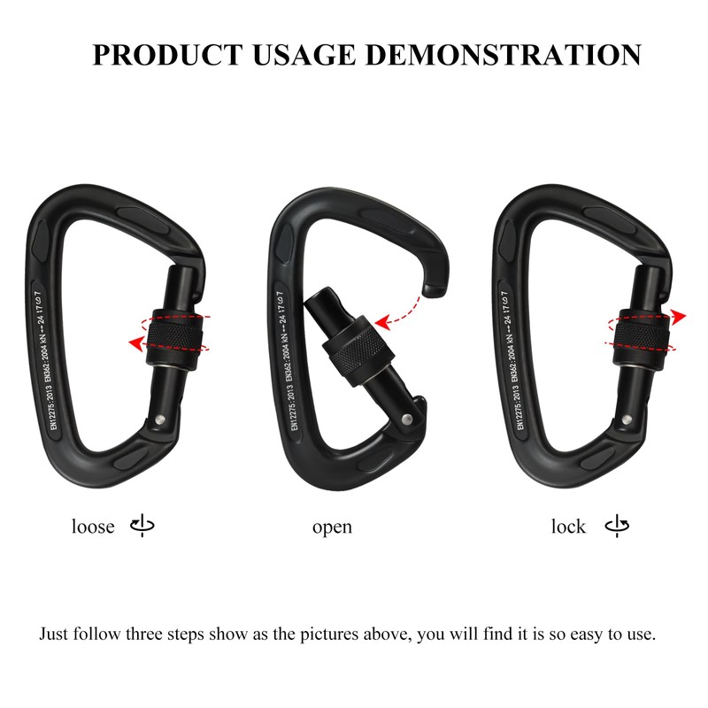 - 【Easy to Use】Carabiner with the screw lock design. They are designed to be strong enough to take huge falls over and over, without weakening, twisting, or getting damaged easily. very easy to use, you can easily operate this carabiners heavy duty with one hand. Turning the screw, you can lock this carabiner easily, then turn it in the opposite direction and turn it on again to unlock it.