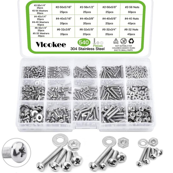 Vlookee 540PCS Machine Screws Assortment Kit #2-56#4-40#6-32 Phillips Pan Head Assorted Nuts Bolts and Flat Washers Kit,Stainless Steel Bolts and Nuts Kit,with Storage Box,for Home Projects