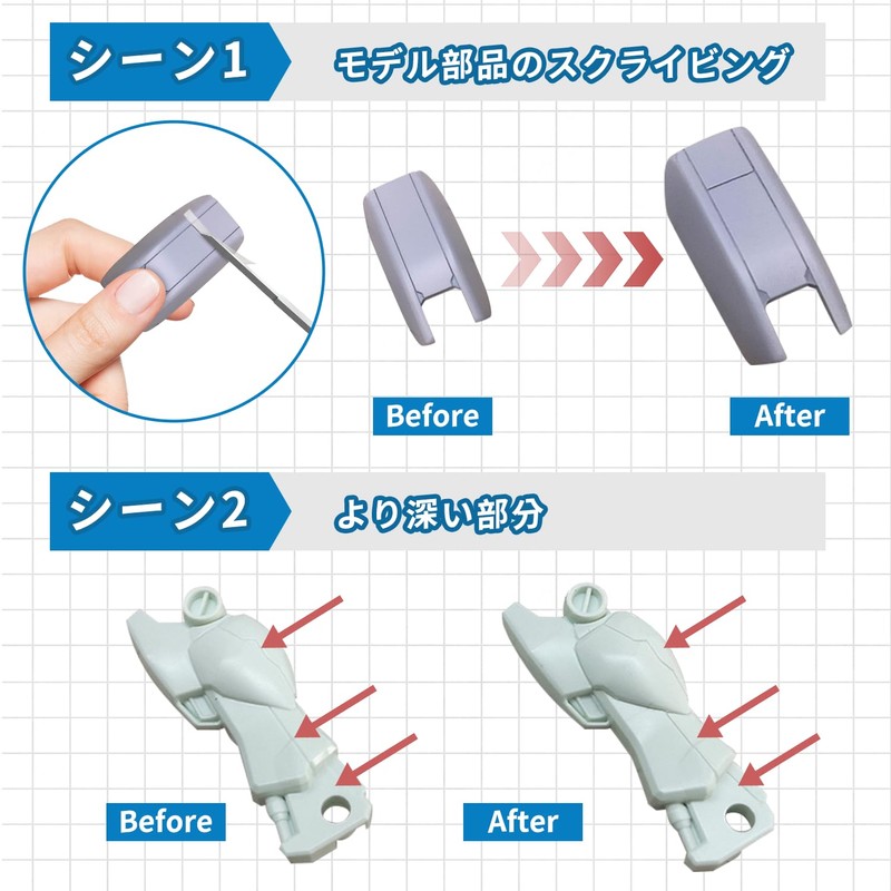 - Processing of Fine Parts: This is a scalloped chisel set that allows you to perform work on fine parts more efficiently. This plastic model tool set is convenient for carving small parts such as Gunpla, Mini 4WD figures, plastic models, and models. It is also useful if you want to clean up the lines and molds of your panel. The Suziboli chisel is suitable for plastic, wood, leather products, paper materials, etc. but not suitable for metal