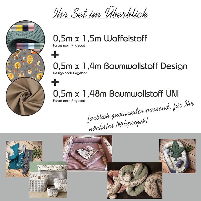 This premium fabric set contains three perfectly coordinated fabrics: soft waffle fabric (100% cotton), high-quality plain cotton fabric and a decorative design cotton fabric. The fabrics are ideal for versatile sewing projects such as baby and children's clothing, crawling blankets, pillows, changing mats, loop scarves or home textiles. Let your creativity run wild.