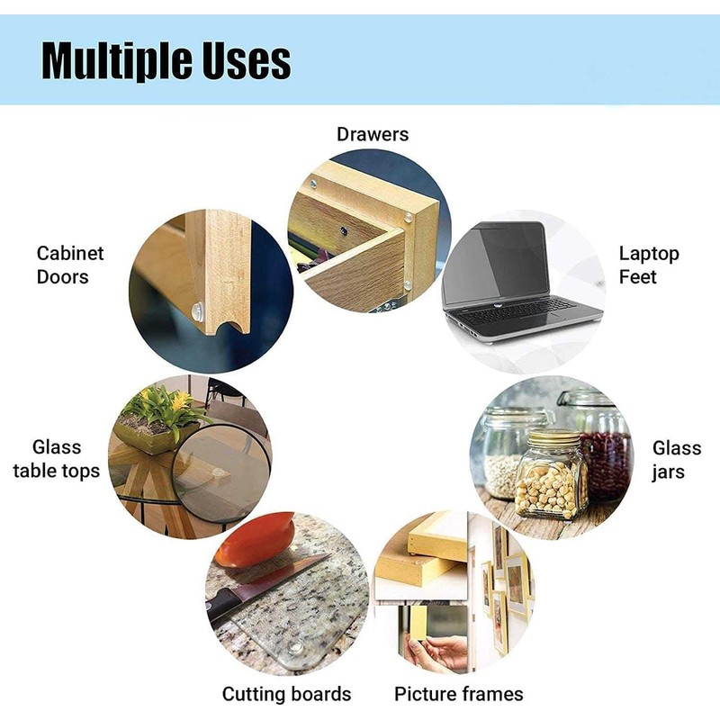 - Parachoques elásticos hechos de goma, transparentes, autoadhesivos, a prueba de golpes, fáciles de despegar sin dejar rastro, se aplican a una variedad de superficies, se adhieren a los elementos que desee, se pueden quedar en el teclado, marco de fotos, mesa , Sillas, cajones, armarios, puertas, otros muebles, etc.