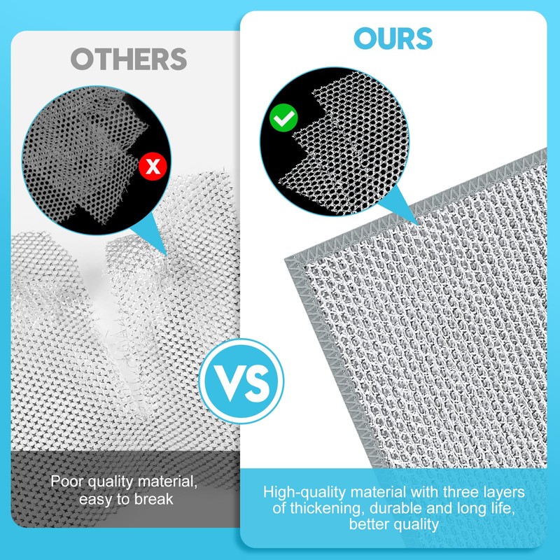 Our non scratch wire dishcloth are made of advanced high-quality materials and precision stitching and use advanced chemical fiber materials Sew three layers of steel wire dishwashing rag, Not only does this provide a powerful cleaning power, but it also ensures that they don't scratch or damage unscratched surfaces. Our wire dishcloth have fine holes that have been specially treated to make them more durable and able to withstand frequent use and cleaning. Can be used in kitchens, garages, showers and a variety of other household cleaning tasks, providing a convenient and efficient solution for kitchen cleaning. Meet your home cleaning needs!