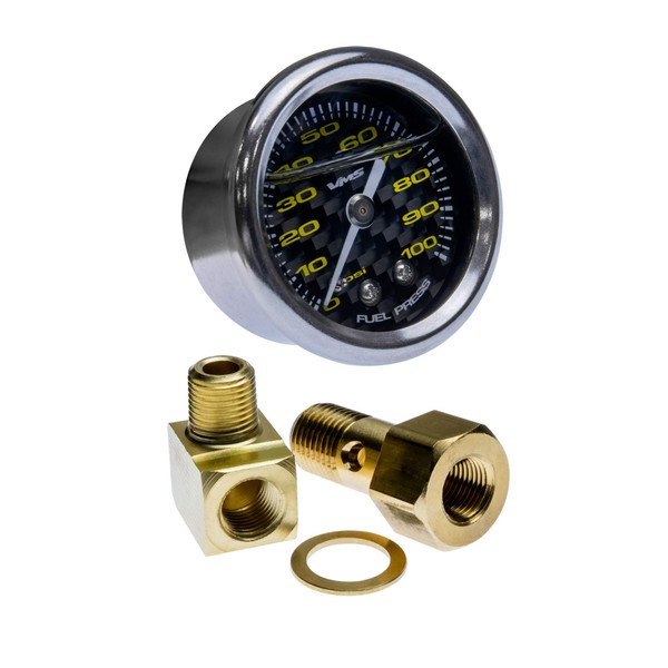 VMS RACING 0-100 PSI Liquid Filled Fuel Pressure Gauge with Adapters Kit in Real Black Carbon Fiber Face Yellow Numbers Compatible with Honda Acura Engines