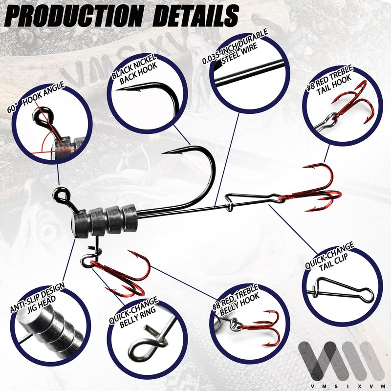 - 【Quick Change and Enhanced Stability and Control】VMSIXVM Tube Jig Heads feature a antislip design, concentrating weight at the front of the tube jigs. This design made tube rig perfect match for tube worms, enhances stability and offers precise control over sinking speed, allowing anglers to manipulate lure's movement with exceptional accuracy. The quick change system will let you securely fastened extra triple hooks in second. It is great tube lures for maximizing fishing success.