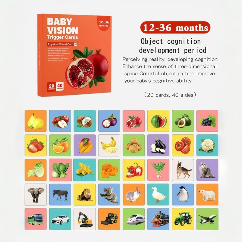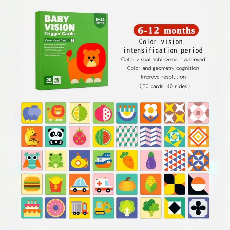 - 0-36 Months, Scientifically Graduated Design:Black and white cards(0-3 months) strengthen the newborn's focusing ability (20-30cm), black and red cards (3-6 months) activate visual tracking during color sensitivity phase, abstract color charts(6-12 months) train shape recognition and connection of brain areas, three-dimensional Color cards (12, color 36 months) promotes spatial perception and logical thinking.
