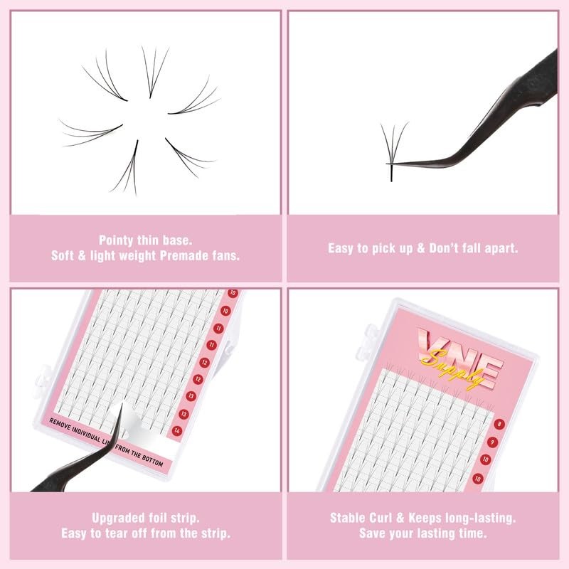 VNE Supply Volume Lash Extensions | russian volume fans lashes | premium false lash extensions | promade mega volume fans | loose premade fans- Soft, Natural, and Effortless! 3D, D curl, 15 mm