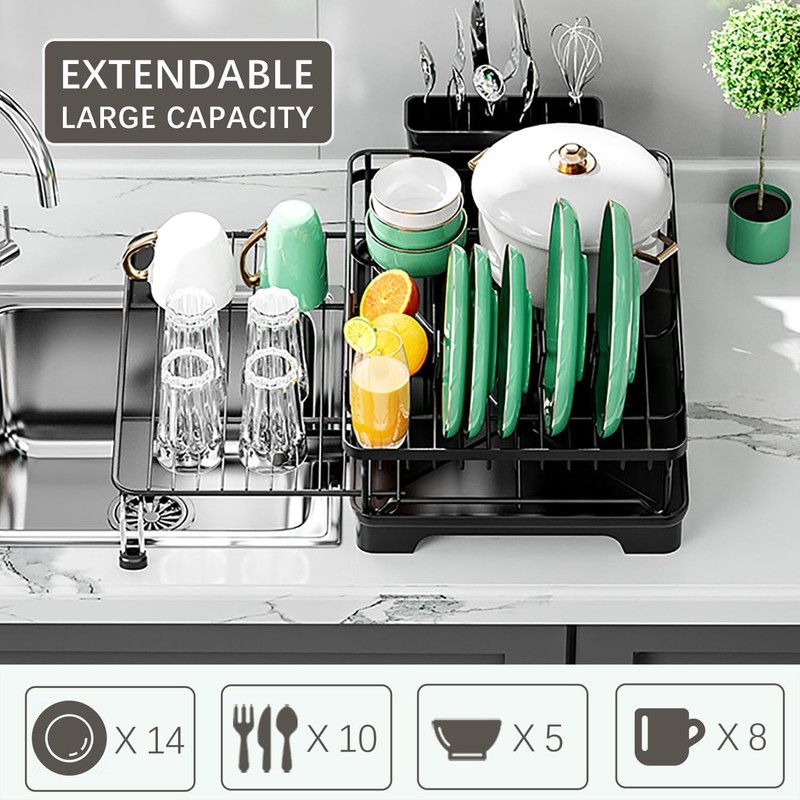 - 【Large Capacity】VNIMTI expendable dish drying rack measures (13.8" to 21.2") Width x 16.5" Depth x 4.9". Equiped with a adjustable extension rack that doubling the shorage space fiting over the sink, VNIMTI disk rack can hold a significant amount of dishes at once including plates, bowls, cups, utensils, etc. Say goodbye to overcrowded countertops and enjoy the convenience of a spacious and organized kitchen.