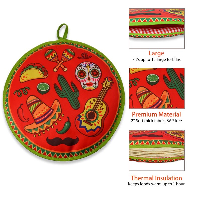 • 革新的な布製トルティーヤウォーマー - 高級ソフト生地と高温ポリエステル断熱裏地、BPAフリー。 電子レンジ対応&食品安全性。 食品を最大1時間温かく新鮮に保ちます。