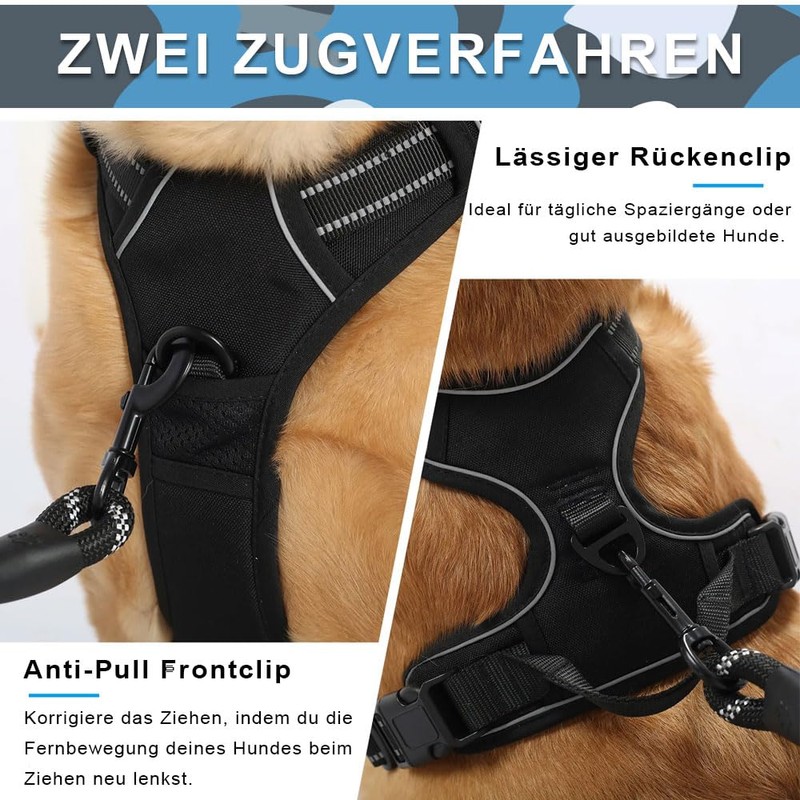 The dog harness also has reflective strips that glow brightly in darker areas and make dogs highly visible in road traffic. Use the chest ring to prevent your dog from pulling when walking, and the back ring is ideal for relaxed walks, etc.