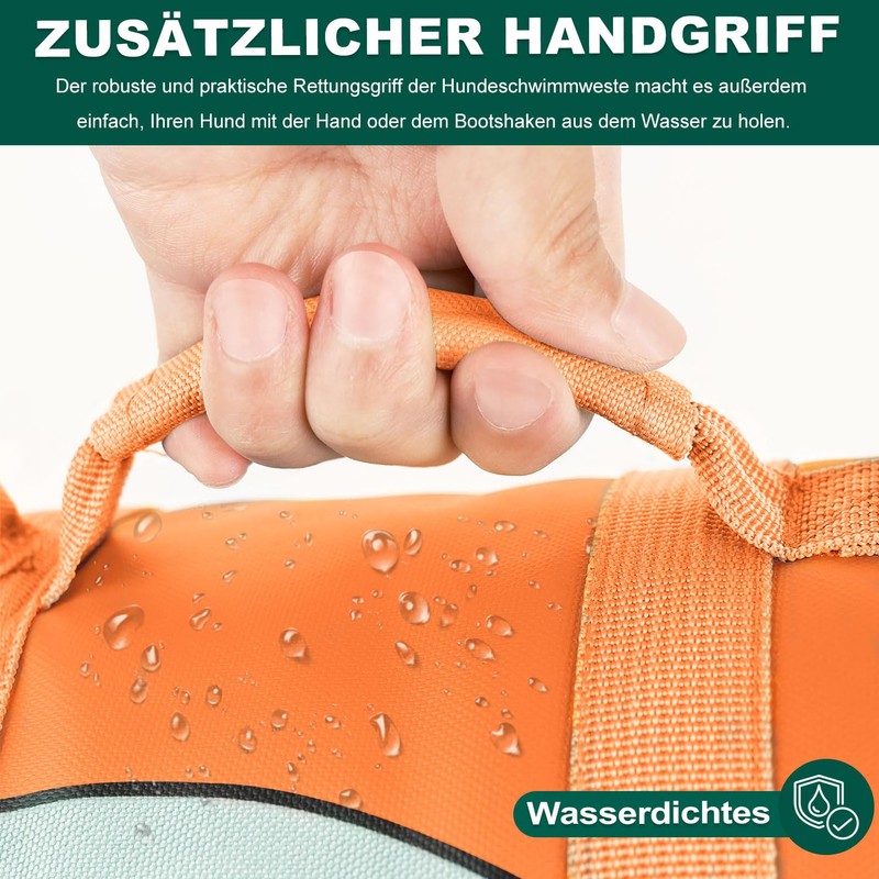 - Portable safety handle: On the top of the dog's life jacket there is a safety handle that allows the dog to be easily lifted in or out of the water. The sturdy flat handle for quick and easy grip makes it easy to get your dog out of any emergency situation. Keep your dog safe.