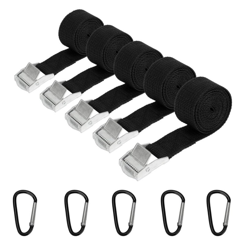- Pack of 5 lashing straps + carabiner hooks: 5 pieces 25 mm, 1.5 m lashing straps + 5 pieces aluminium alloy carabiner hooks, suitable for daily use