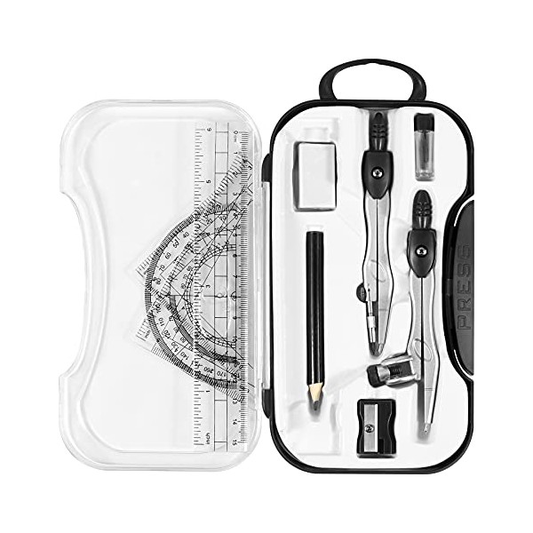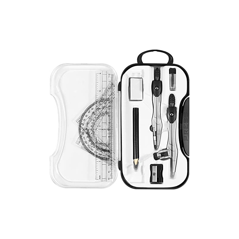 - A Practical Compass Geometry Set:Durable metal compasses will not bend or flex during use, Ergonomically designed compass head is comfortable to hold, Universal Holder Compass work with any standard sized pencil or pen, Rulers, Triangles & Protractor feature a graduations for easy identification along. With a Durable Storage Box, Easy to carry and store.