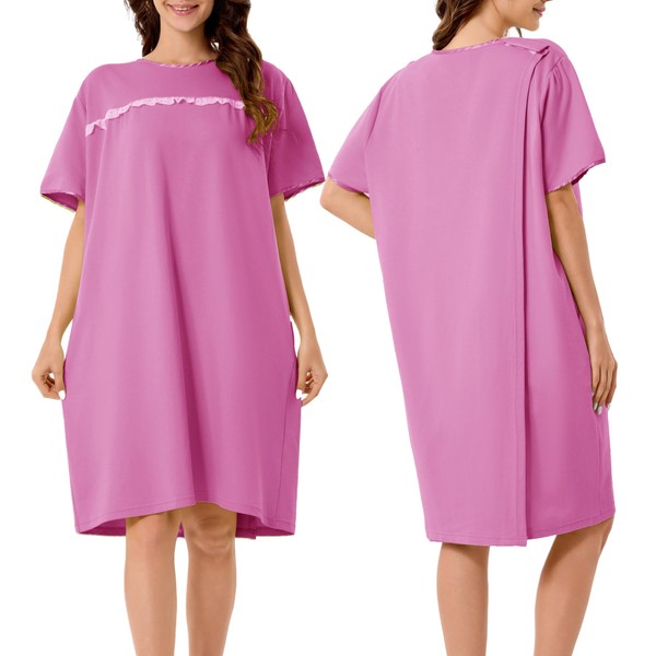 voeeron Hospital Gowns for Women Soft Short Sleeve Patient Gown Open Back Snap Adaptive Clothes with Pockets (Pink,L)