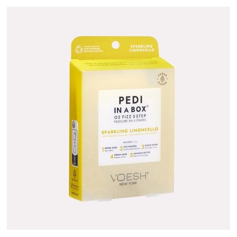 Get fizzy! Let your skin drink up all of the benefits of our all-in-one Pedi in a Box O2 Fizz. This spa pedicure kit includes a detox soak, fizz powder, sugar scrub, cream mask, and massage butter. The fizz powder creates a unique, enjoyable experience that helps to detoxify feet and enhance blood circulation.