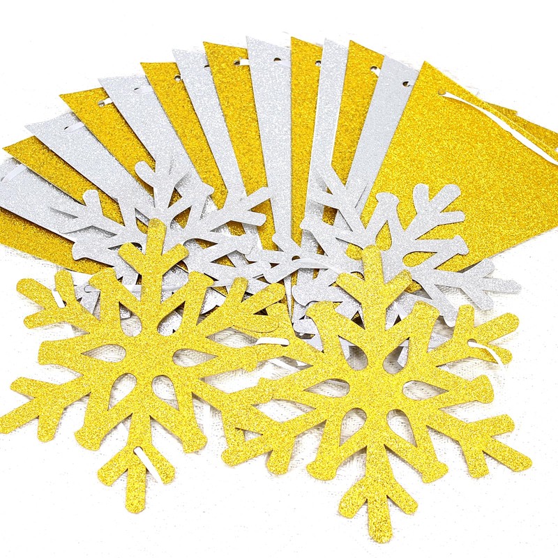 - Multiple occasions.The gold silver glittery flags and paper snowflakes can be decored indoor for home,office and classroom christmas decorations.Suitable for hanging on christmas tree,windows,wall,ceiling,fireplace or dessert table as winter party backdrop for a photo booth.Will surely add a touch of glamour to your celebrations.
