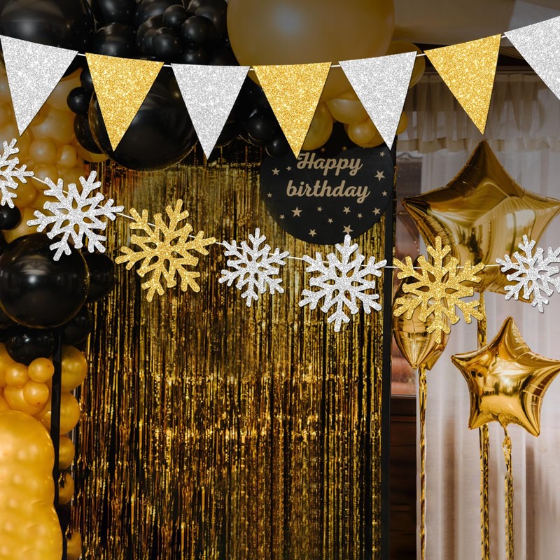 - The christmas party decorations pack includes 1set glittery gold silver triangle banner flag and 1set shiny paper snowflakes banner,is a good addition to the christmas party,brighten up the winter holdiay or birthday celebration.