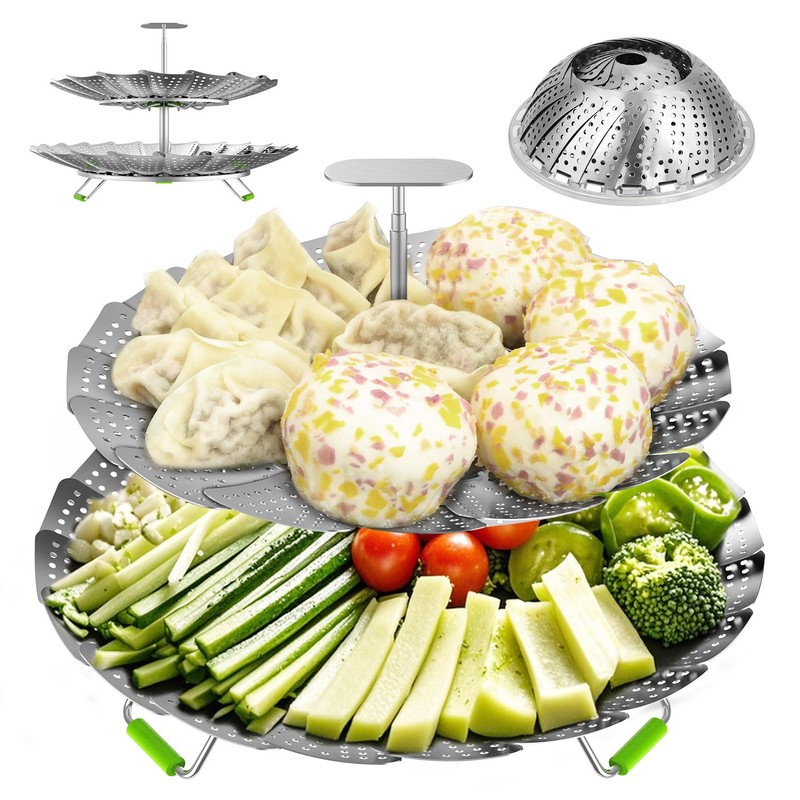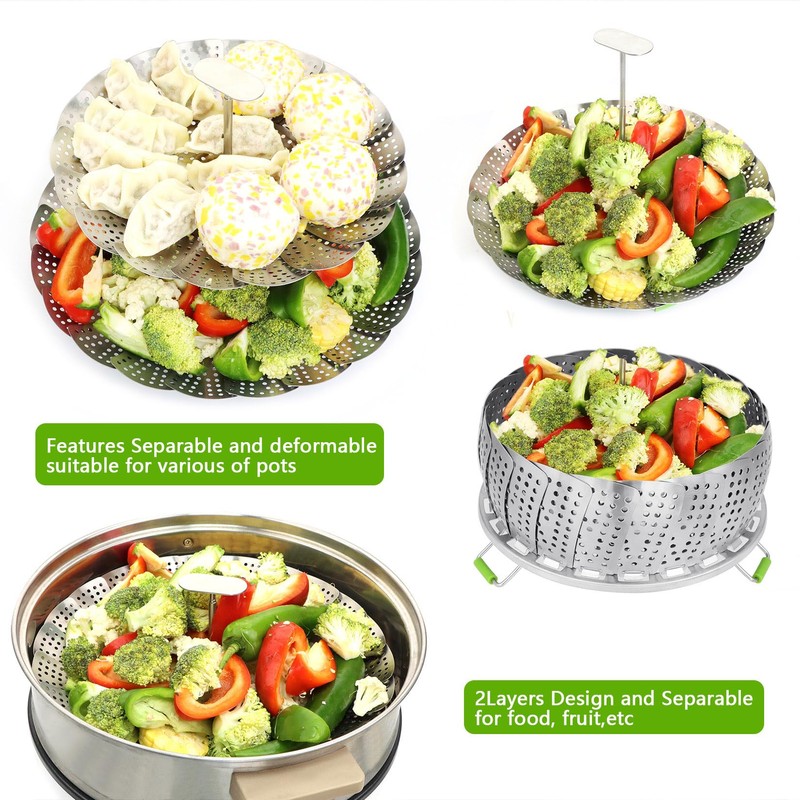 • Versatile 2 Layer Steamer Basket: This 2-tier stainless steel steamer basket allows steaming multiple types of food simultaneously; And can be disassembled and separated into large and samll one to use, 9.2'' and 11'' at full open;