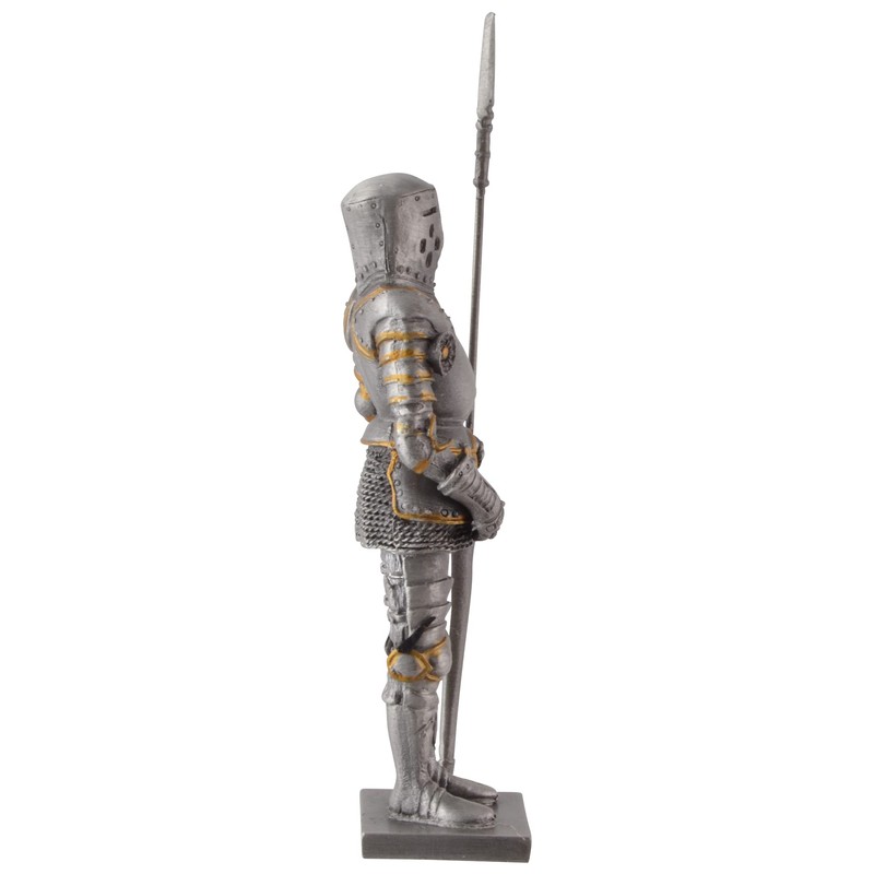 Knightship had its origins in the Germanic entourage. Already the early medieval caretakers and kings of the Carolingians created a powerful army of mounted followers. Against the surrender of ground and ground as fiefs, they performed war services as knights to their lords. The term knight was due to fighting on horses. So they were mounted warriors, knights for short, who were equipped with helmet, shield and lance, iron chainmail as well as arm and leg braces. The heavy, immovable plate tanks were not combat, but only tournament armor. Knight armies ruled the theatres of war in the high Middle Ages. The noble knighthood experienced its heyday, and the knight became the leading figure of court society at the imperial and princely courts. The decline of chivalry occurred in the late Middle Ages. The knighthood possessed a code of honor with precisely prescribed knightly virtues and behaviors. These included the obligation to minnedienst and participate in tournaments. This figurine is cast in pewter and painted by hand.