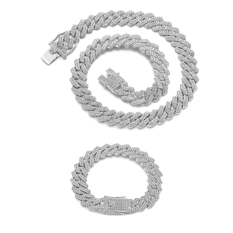 Introducing the VOGLUX 2PCS Iced Out Cuban Link Chains Set for Men – A Stunning Miami-Inspired Statement Piece Elevate your style game with the VOGLUX 2PCS Iced Out Cuban Link Chains Set for Men, featuring a dazzling Cuban link bracelet and a Cuban chain necklace that exude opulence and hip-hop flair. Crafted with meticulous attention to detail, this jewelry set is designed to make you stand out in any crowd. Exquisite Design and Sizing Options The VOGLUX set includes a striking Cuban link bracelet measuring 20cm (8 inches) in length and a versatile Cuban chain necklace available in four different lengths: 40cm (16 inches), 45cm (18 inches), 50cm (20 inches), and 60cm (24 inches). The chain boasts a substantial 14mm width, ensuring its presence is felt wherever you go. To ensure the perfect fit, we recommend using a string to measure your wrist or neck, allowing you to select the size that suits you best. Premium Materials for Lasting Brilliance Our Iced Out Cuban Chain Set is a masterpiece of craftsmanship. The Cuban link bracelet and chain necklace are both made from high-quality alloy, ensuring durability and longevity. The dazzling brilliance of AAA+ rhinestones meticulously set by hand adds a touch of luxury to your ensemble. The high-tech electroplating treatment guarantees that these chains are resistant to tarnishing and fading. Rest assured, they are nickel-free, lead-free, and completely safe for your health. A Versatile and Stylish Addition to Your Wardrobe The VOGLUX Iced Out Chain Set is not just an accessory; it's a statement. Perfect for everyday wear, it adds a touch of extravagance to your style. Whether you're performing on stage or simply hitting the streets, these chains will complement your look effortlessly. Ideal for men, husbands, or any hip-hop enthusiast, this set is a standout gift choice for special occasions such as Valentine's Day, Christmas, birthdays, and more. Embrace the vibrant, Miami-inspired style with this