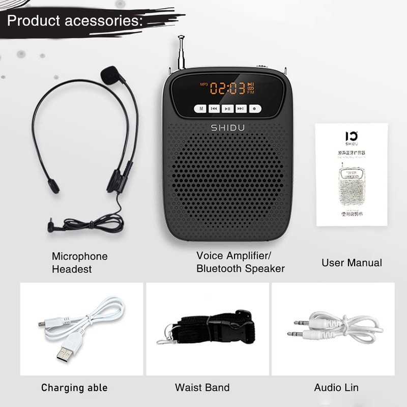 - This personal voice amplifier features a wired headset microphone, with its customizable gooseneck structure near the mouth. It could sit quietly over your head and does not fall off. You can change the distance between your mouth and the microphone.