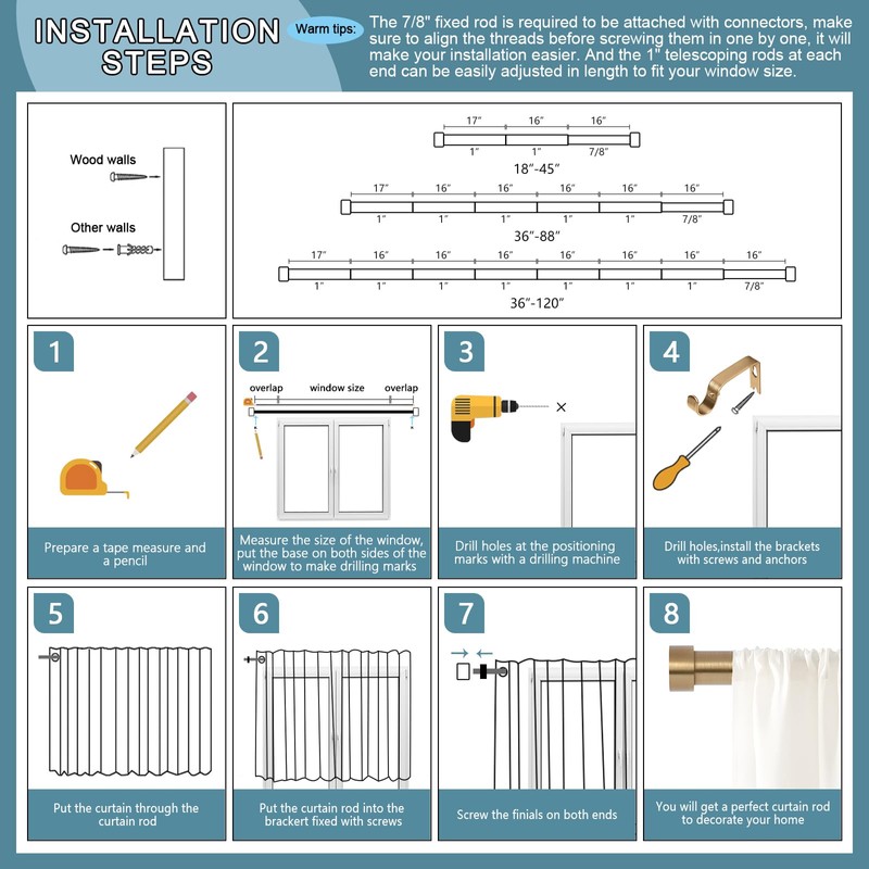 - Package Includes:17'' rod*5(1''fixed rods*5),16''rod*1(7/8''telescopic rods*1), 2 finials, 3 brackets, 6 screws ,6 anchors