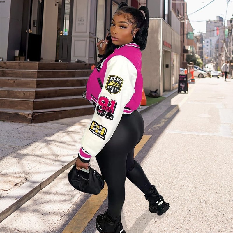 • ♥ Features: Varsity jacket, button closure, long sleeves, stand-up collar, pattern on bottom hemline, side pockets, street style.