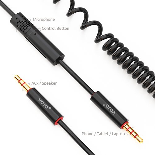 VOJO Male to Male Tangle-Free Coiled Auxiliary Cord with 3.5mm Gold Jack and Mic, 4 Feet (1.2 Meters) - Black