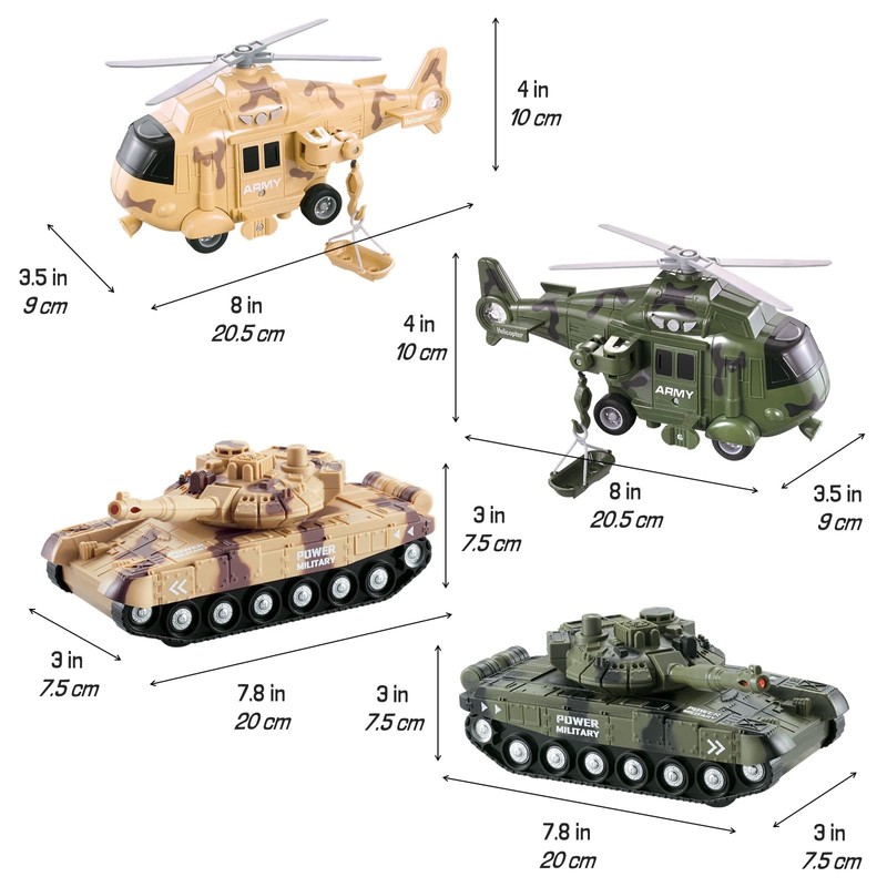 - REALISTIC, SAFE, AND DURABLE: All vehicles in the Armed Forces bundle have multiple functions, including realistic movements and friction powered wheels! They are crafted with exciting features to enhance the fun while boosting your child’s cognitive development, hand-eye coordination, and imaginative skills! Each vehicle is durably built, made with 100% safe material, meets US toy standards, BPA free and non-toxic. Please refer to product images for the exact dimensions of each item.
