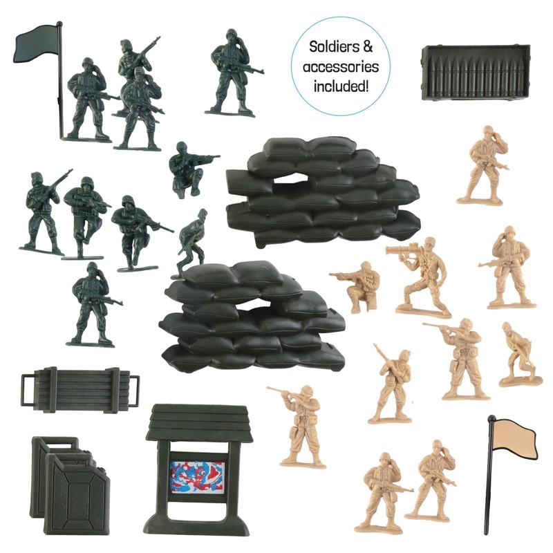 - Armed Forces Set Includes: 1 green helicopter, 1 green tank, 1 desert helicopter, 1 desert tank, 10 green soldiers, 10 desert soldiers, 1 green flag, 1 desert flag and battlefield accessories