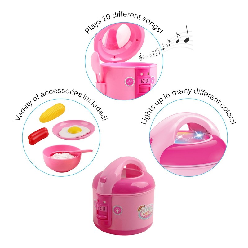 - LIGHT AND MUSIC (BATTERY OPERATED): For even more fun, the rice cooker makes realistic sounds, plays charming musical melodies and projects LED lighting from inside. These features are sure to delight the little ones and have them play along. Toy Rice Cooker requires 3 x AA batteries (not included) for the lights and music to operate.