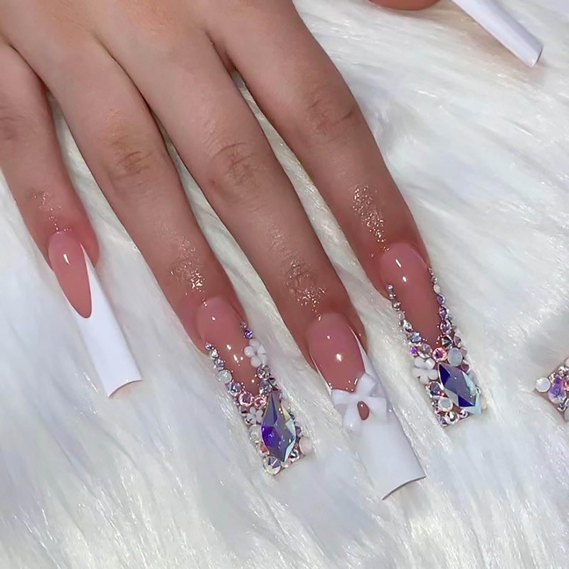 Vokupoga Long Square Press on Nails Sparkly False Nails with Rhinestones Designs, White French Tip, 24 Pcs