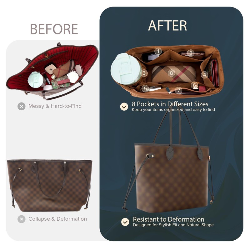 - [Maintain Bag Shape]: Included with the organizer is a Base Shaper that helps maintain the structure of your handbag. Ideal for softer bags like the Neverfull, and Speedy, it prevents sagging and keeps your bag looking pristine. For sturdier bags like the On the Go, and Book Tote simply remove the base shaper to reduce weight during travel.