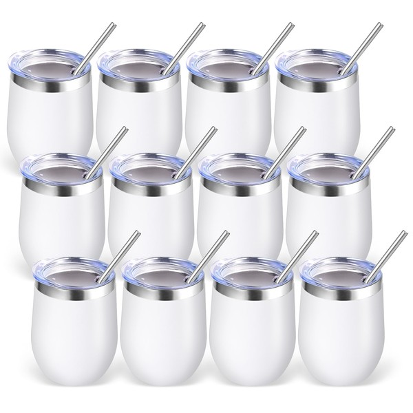 Volhoply 12oz Stainless Steel Wine Tumbler with Lid Bulk 12 Pack,Double Wall Vacuum Stemless Wine Glasses,Reusable Metal Travel Coffe Mug with Straw,Insulated Cups Gifts for Christmas(White,12 Set)
