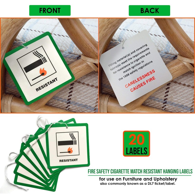 • ?? FIRE-PROOF CONFIDENCE DL7 fire safety labels on furniture items like sofas, chairs, and mattresses indicate that these pieces have been treated or constructed with fire-resistant materials. Have the peace of mind knowing that your furniture is less likely to contribute to the spread of flames in case of a fire using our fire retardant labels for furniture.