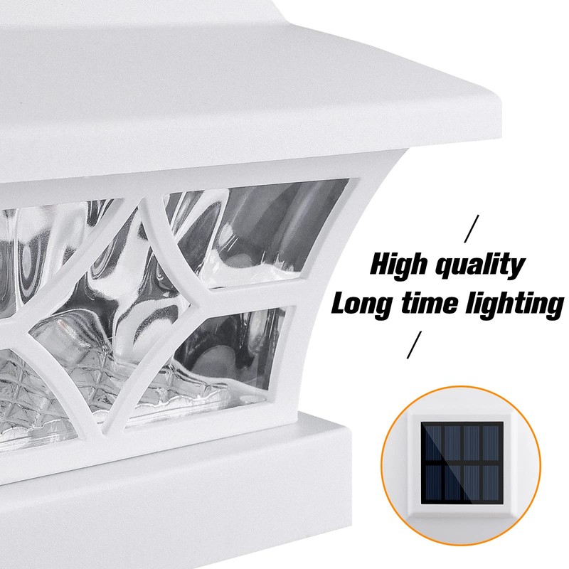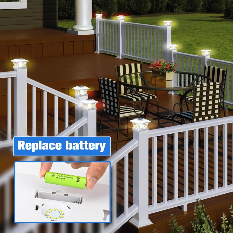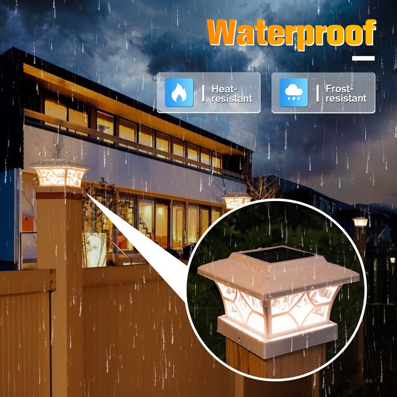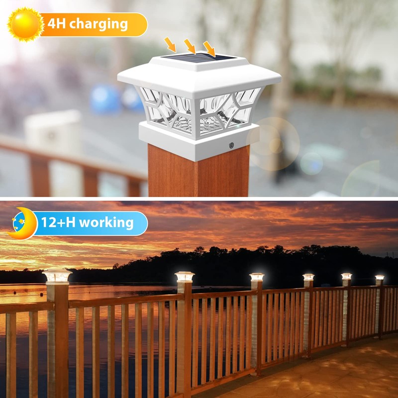 - ☔ [WEATHERABLES] Vinyl fence post solar lights have been upgraded with IP44 waterproof material, which it can withstand high temperature heat, pouring rain, snowstorm or any other outdoor environments. These post cap of vinyl fence post cap lights protect your post from rain and sun to prevent premature rotting!