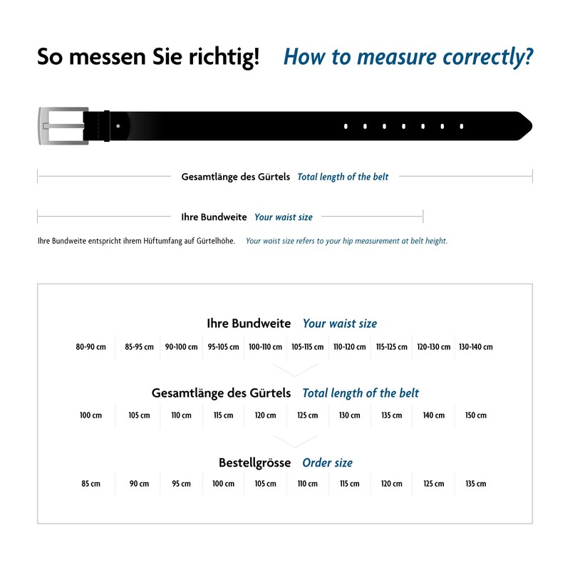 - Dimensions: The size selected above is the waistband. Total length of belt is always approx. 15 cm longer. A more detailed explanation of the waistband is provided in one of the pictures [English language not guaranteed].