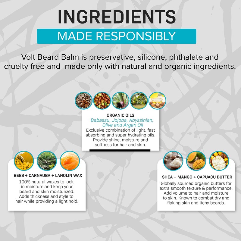 - Volt beard style balm is preservative, silicone, GMO, phthalate and cruelty free product, made only with natural and organic ingredients: bees, carnauba, lanolin wax; shea, mango and capuacu butter; babassu, jojoba, abyssinian, olive and argan oil.