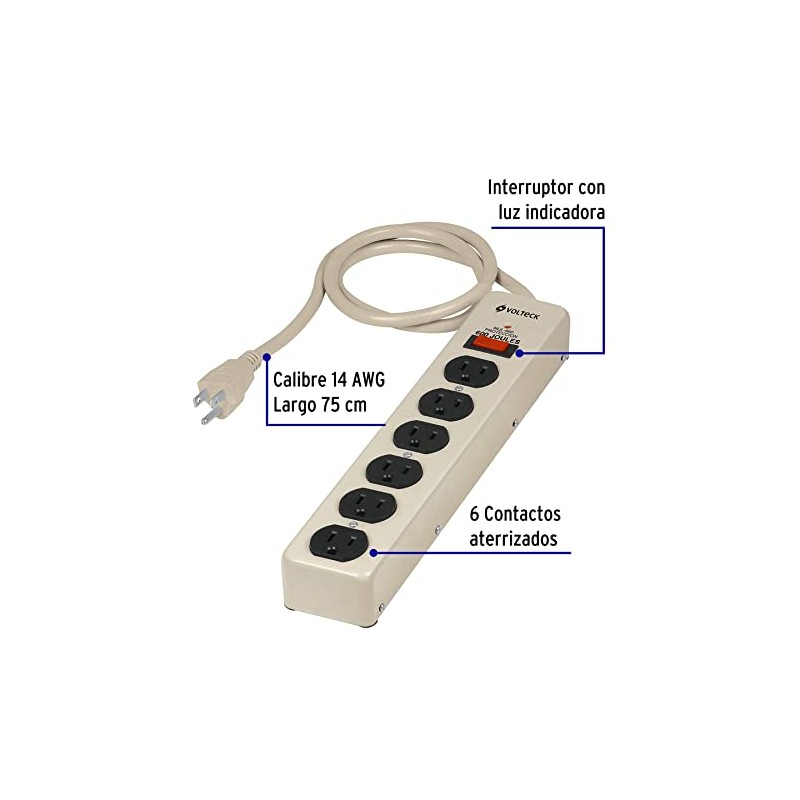 Volteck MUL-660, Multicontacto uso rudo, 6 entradas, supresor, 600 joules