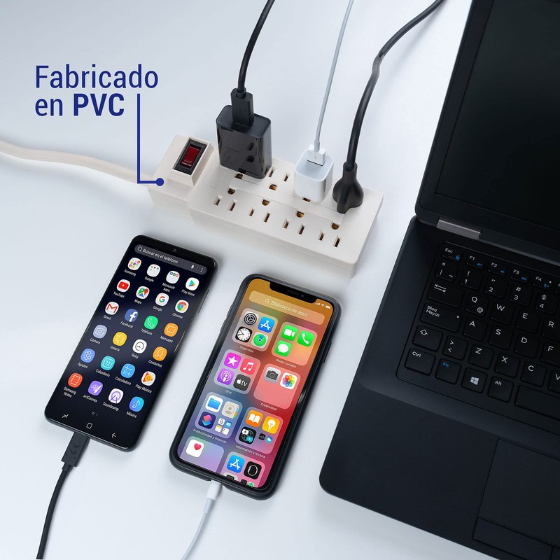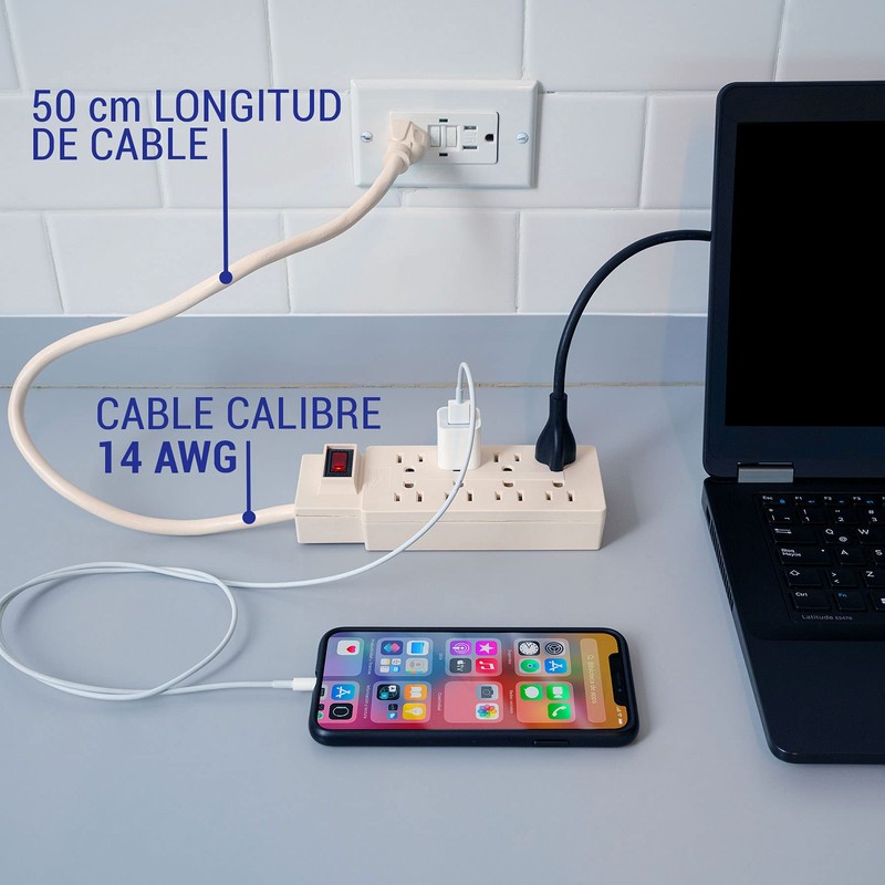 - Número de contactos 8, calibre 14 AWG (2.08 mm²), tensión 125 V, corriente 15 A, frecuencia 60 Hz, potencia 1 875 W, longitud de cable 50 cm