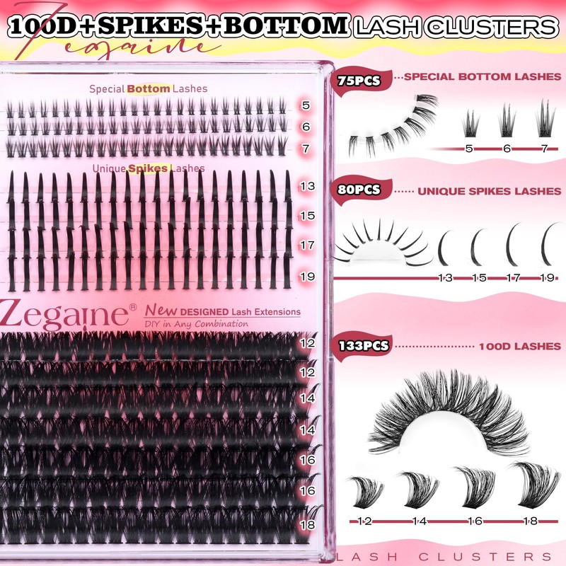 - 【3-in-1 Lash System–3 Stunning Styles, 11 Lengths】Take control of your lash game with Zegaine’s DIY lash clusters! This 288pcs value-pack includes: 75pcs bottom eyelash clusters(5-7mm), 80pcs D-curly lash clusters spikes(13-21mm) and 133pcs 100D eyelash clusters (12-18mm). With lower lashes cluster, you'll get salon-level eyelash extensions!