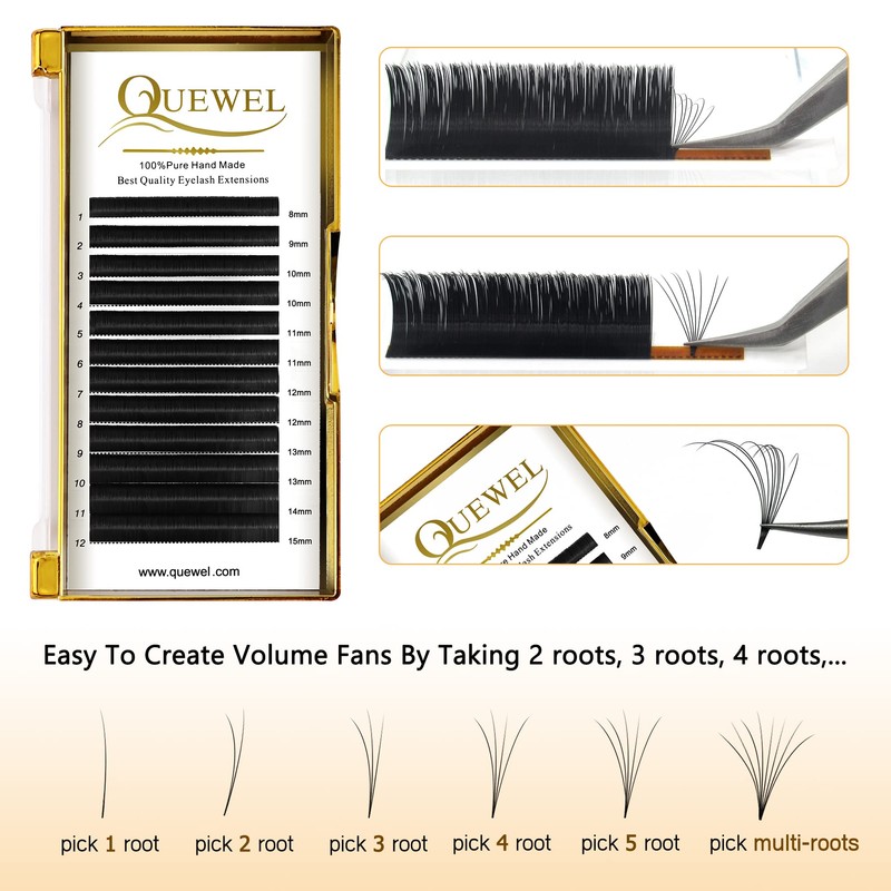 - Quewel volume lashes for eyelash extensions: 0.03 thickness, D curl, 15 mm length, 12 rows per tray, 100% handmade artificial silk lashes for eyelash extensions