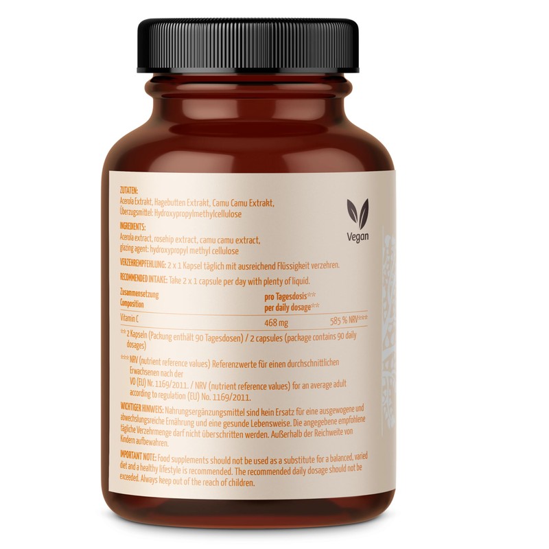 - VITAMIN C Naturreine Vitamin C Extrakte aus Acerola, Hagebutte und Camu Camu. Mit gesamt 468mg Vitamin C pro Tagesdosis (2 Kapseln pro Tag).