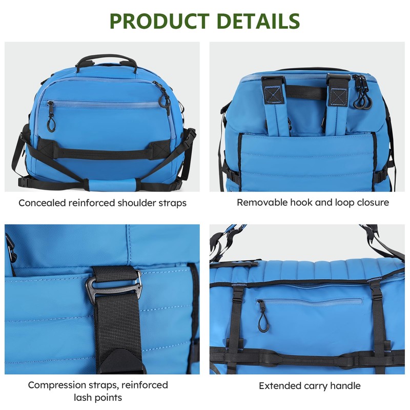 - Ample Storage: 86L main compartment,U-shaped mesh pocket,padded laptop sleeve,waterproof side pocket and shoe compartment