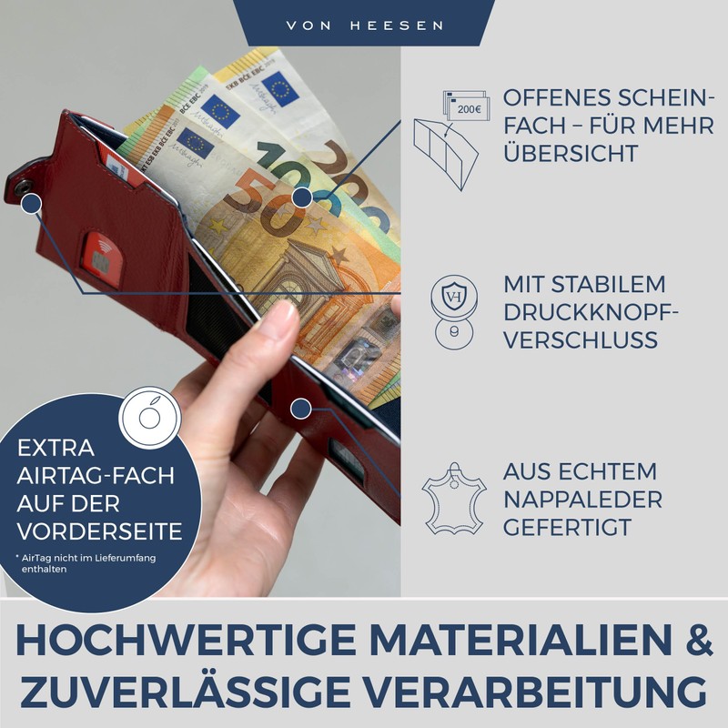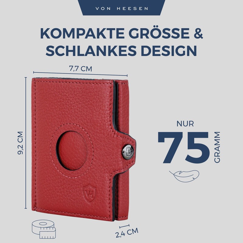 - ✔ Ingenious space miracle – the Airtag mini wallet offers 5 card slots, XXL coin compartment for 4-5 coins and a full-fledged note compartment for large banknotes up to 200 €.