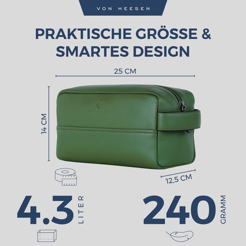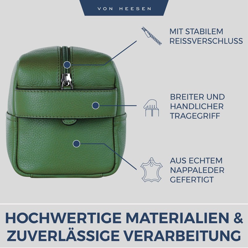 VON HEESEN Toiletry Bag Leather Toiletry Bag for Men and Women - Genuine Leather Necessaire Ideal for Travel - Wash Bag and Cosmetic Bag, Green, 1 main compartment