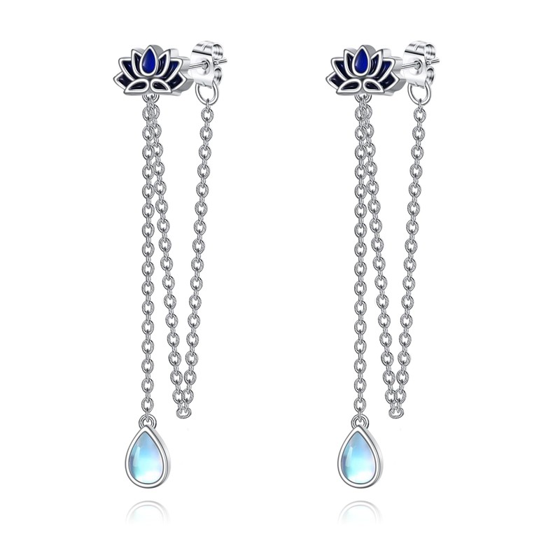 VONALA Moonstone Lotus Chain Earrings Dangling 925 Sterling Silver Lotus Dangle Drop Earrings Long Chain Style for Women Girls