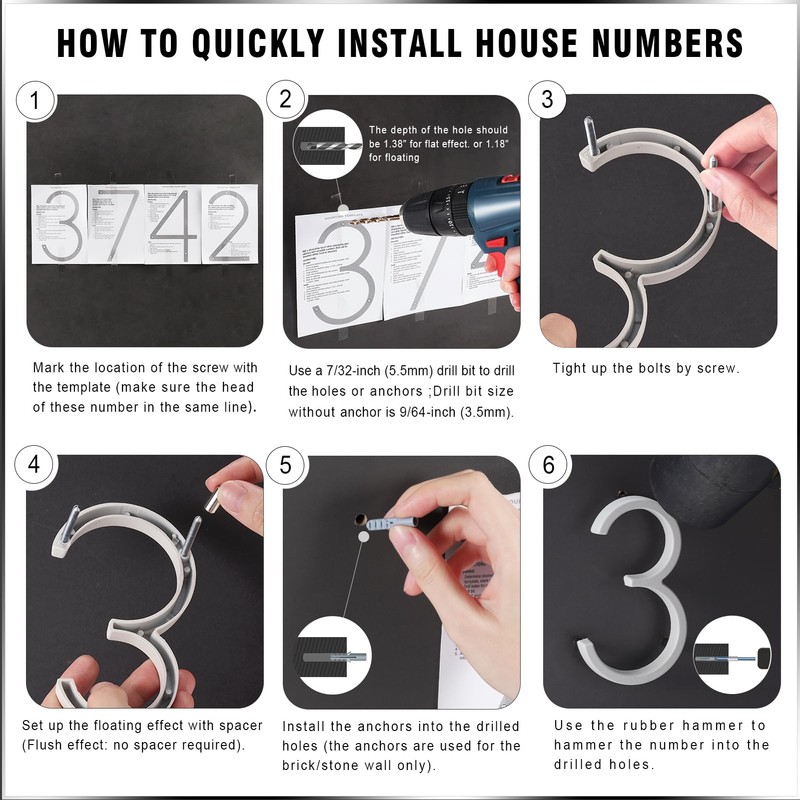 - Easy Installation: Our numbers for address on house include 1 metal house number; 1 installation template; 3 installation screws; 3 anchor bolts; and 3 metal floating brackets (for floating installation); following the steps in the operation manual, you can securely install them in any drillable surface such as wooden boards, house walls, mailboxes, etc
